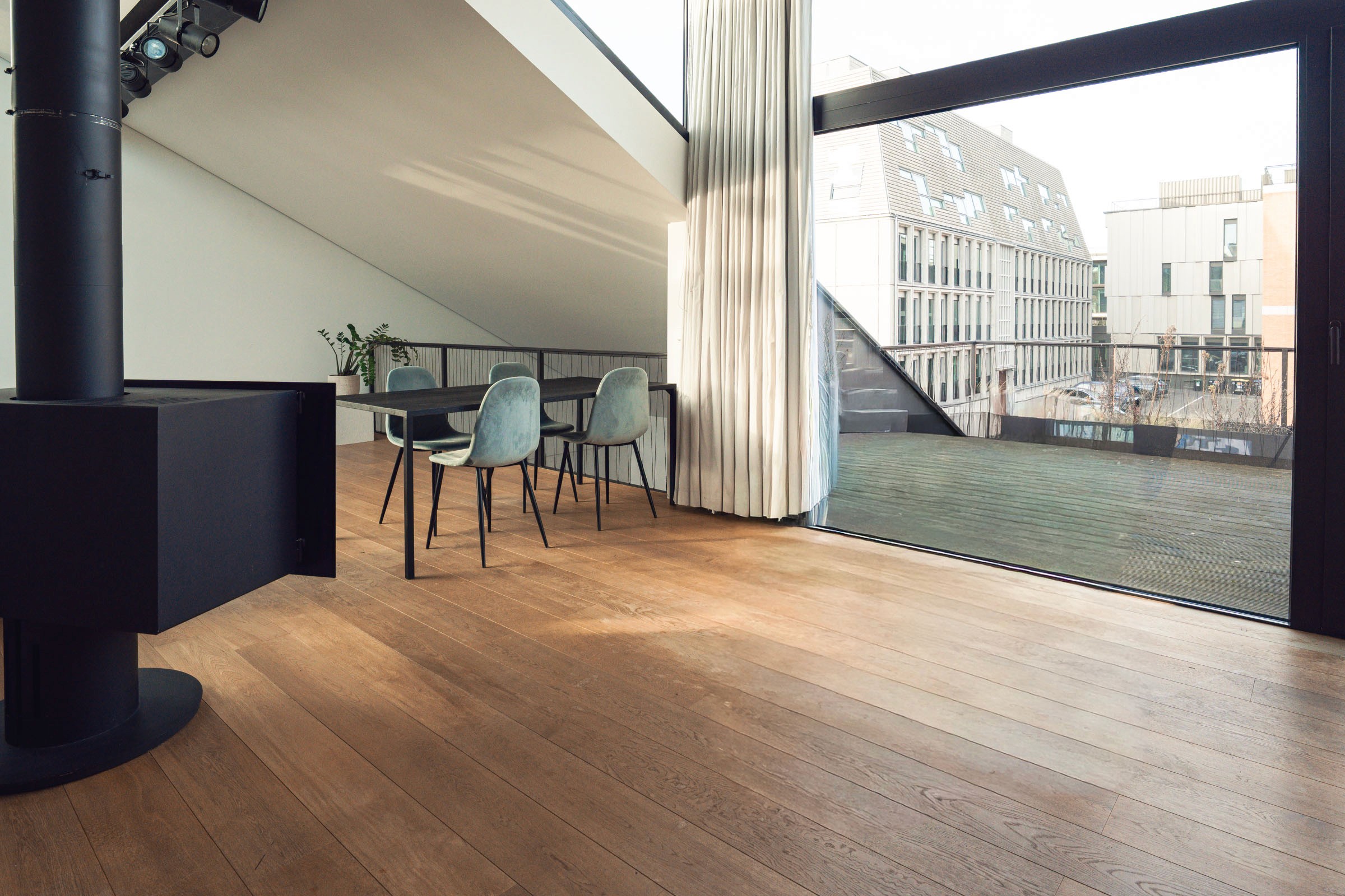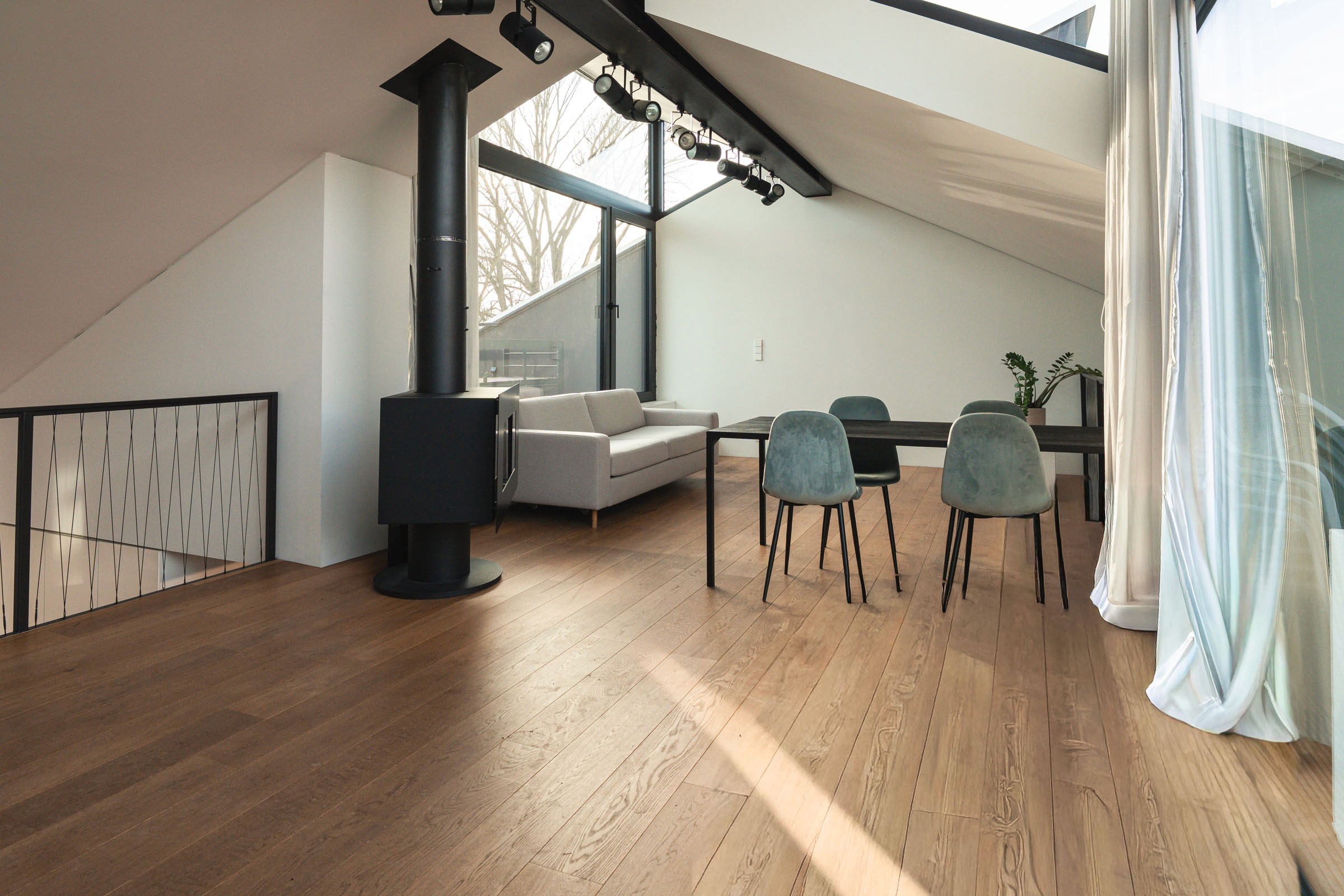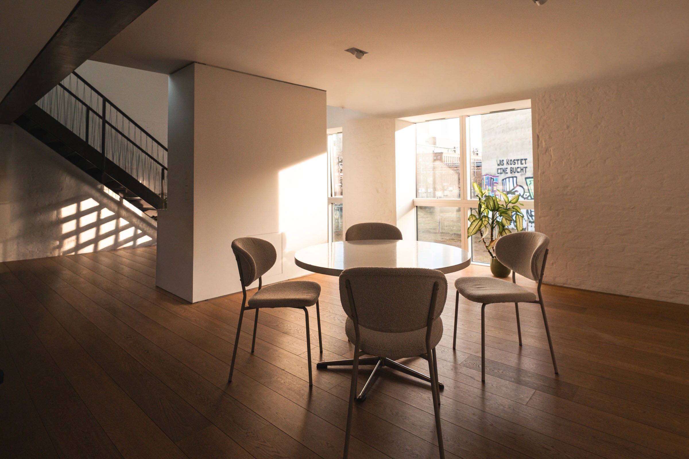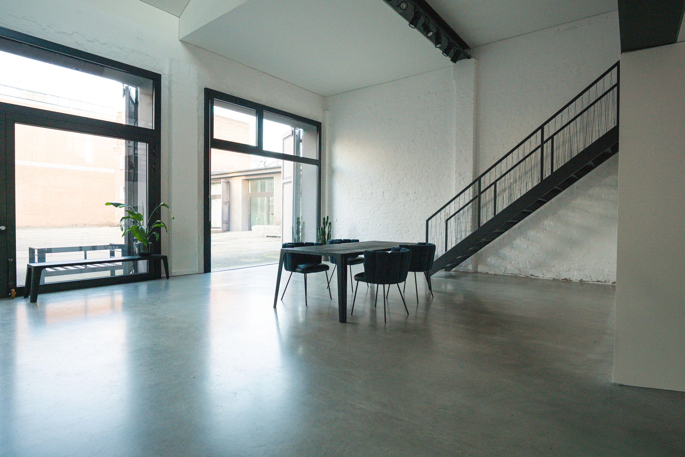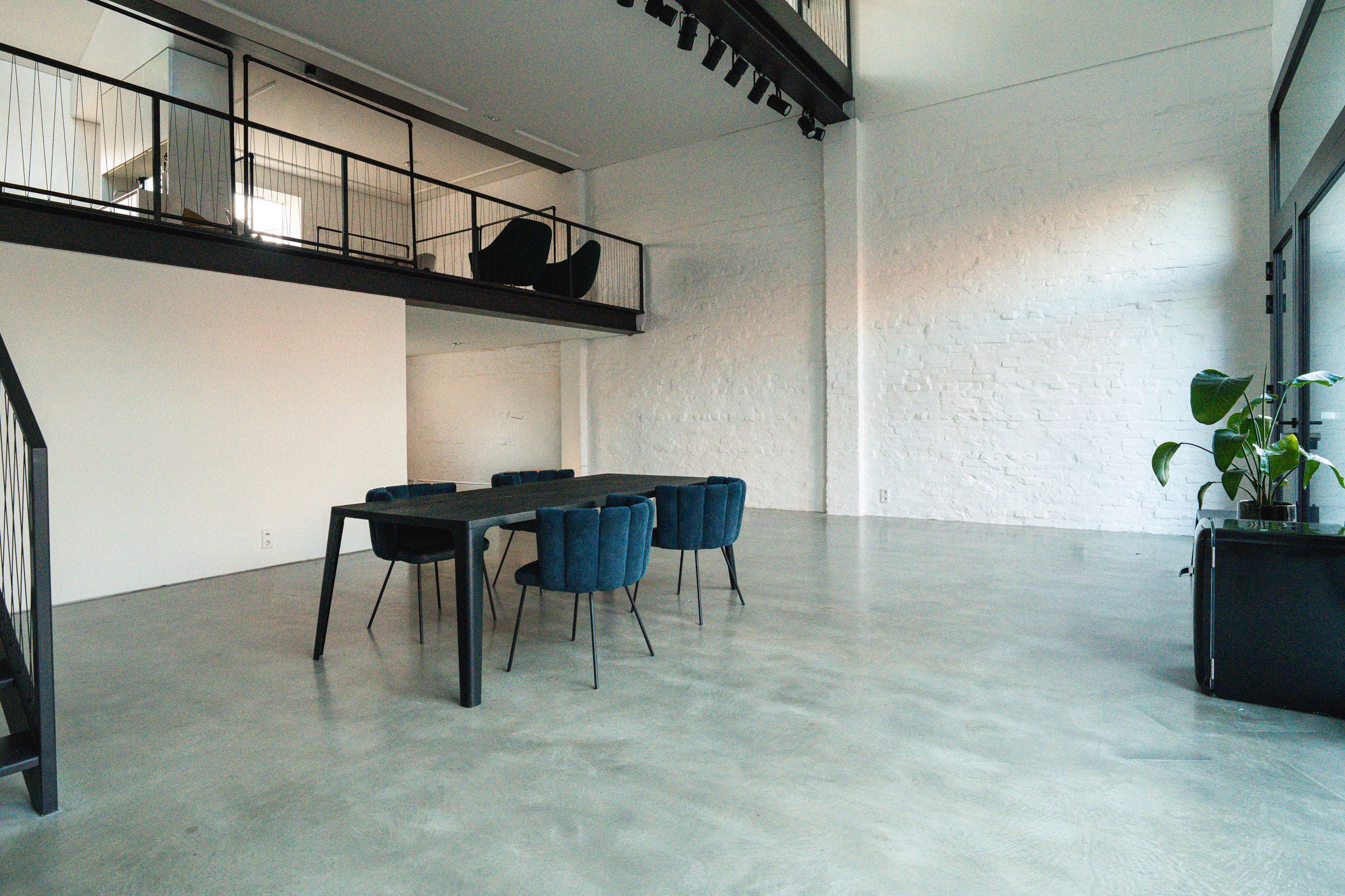 A space defined by white brick textures and all-day light. The architecture offers full flexibility, balancing a massive industrial shell with a sense of warmth and grounded privacy.